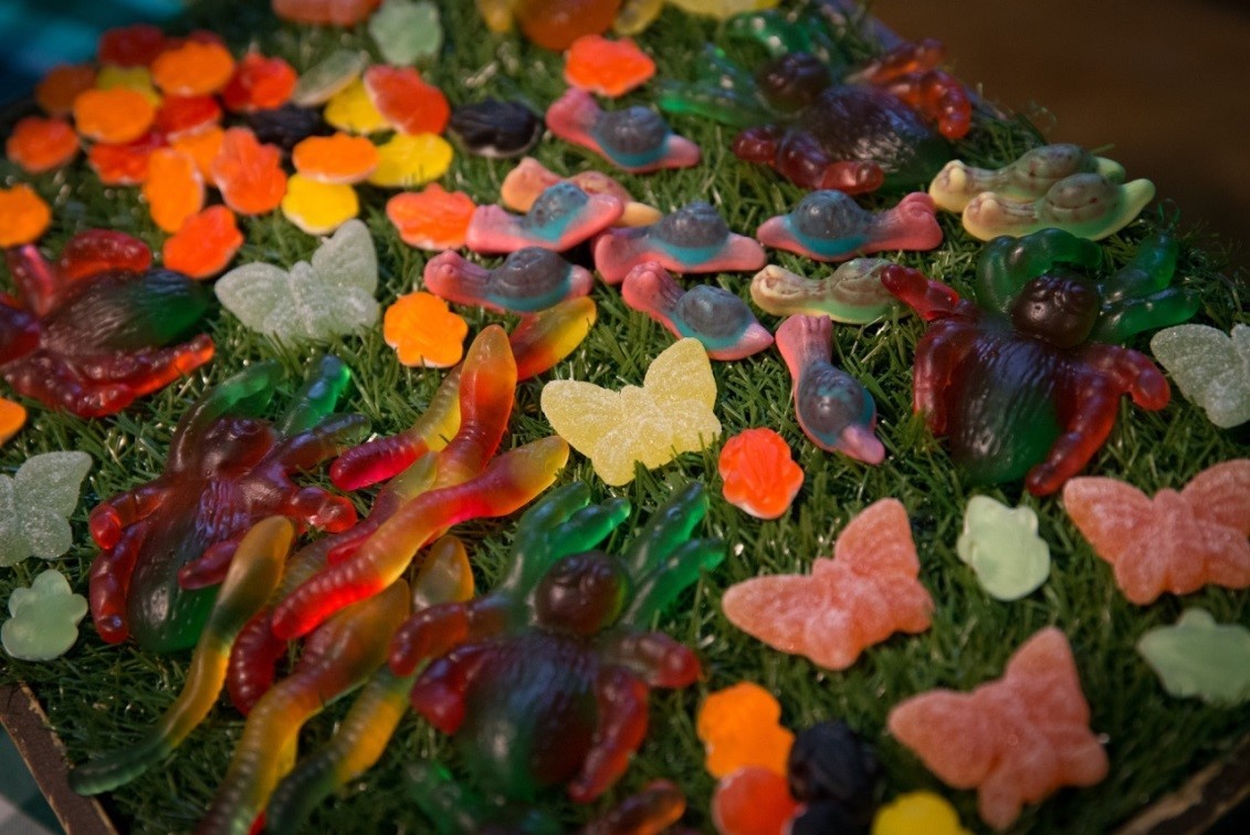 Guests were treated to kid-friendly swamp juice on arrival, served in jam jars with green straws (of course!). Brunch was served and included mini fruit skewers, Welsh smoked bacon and Cumberland sausage in a savoury muffin, and mini smoked salmon and cream cheese bagels. A variety of different flavoured and coloured mini bug jellies were served on faux grass canapé trays.